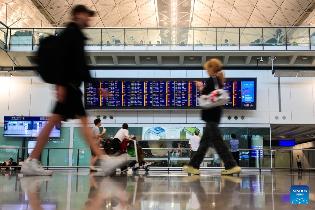 Passengers walk past a flight information board at the Hong Kong International Airport in Hong Kong, south China, July 20, 2025. Typhoon Wipha passes through Hong Kong with hurricane signal No. 10 issued, bringing severe weather and citywide disruptions.