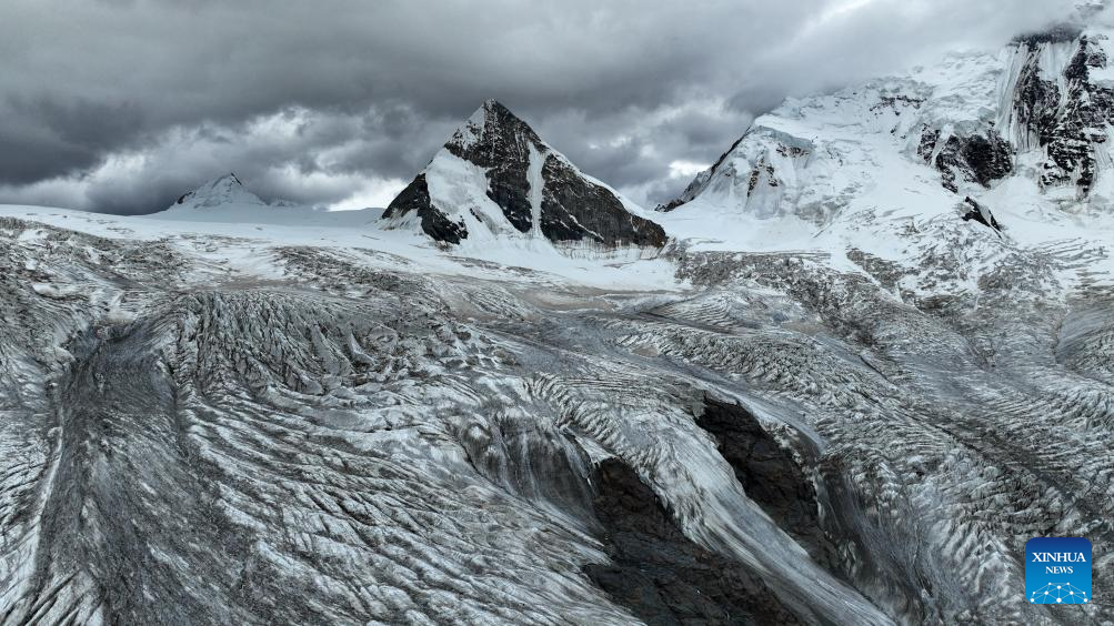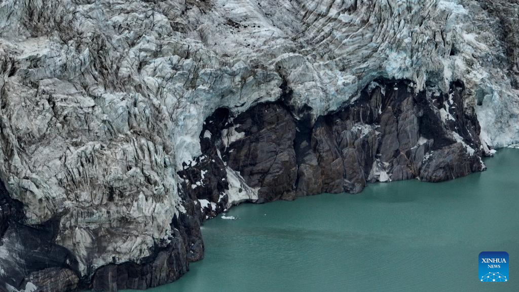 An aerial drone photo taken on July 19, 2025 shows the end of a glacier tongue on Sapukonglagabo Mountain in Biru County, Nagqu City, southwest China's Xizang Autonomous Region. The Sapukonglagabo Mountain, with a main peak soaring to nearly 7,000 meters above sea level, is favored by tourists for its magnificent snow-capped scenery, spectacular glaciers, and abundant wildlife. (Xinhua/Jigme Dorje)