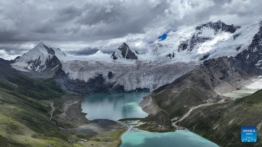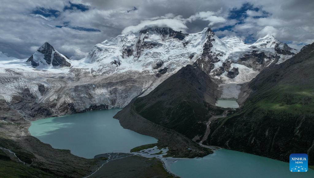 An aerial drone photo taken on July 19, 2025 shows a view of the Sapukonglagabo Mountain in Biru County, Nagqu City, southwest China's Xizang Autonomous Region. The Sapukonglagabo Mountain, with a main peak soaring to nearly 7,000 meters above sea level, is favored by tourists for its magnificent snow-capped scenery, spectacular glaciers, and abundant wildlife. (Xinhua/Jigme Dorje)
