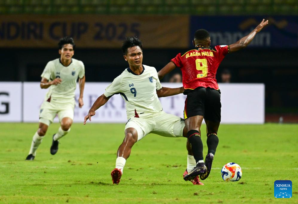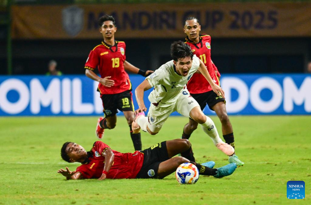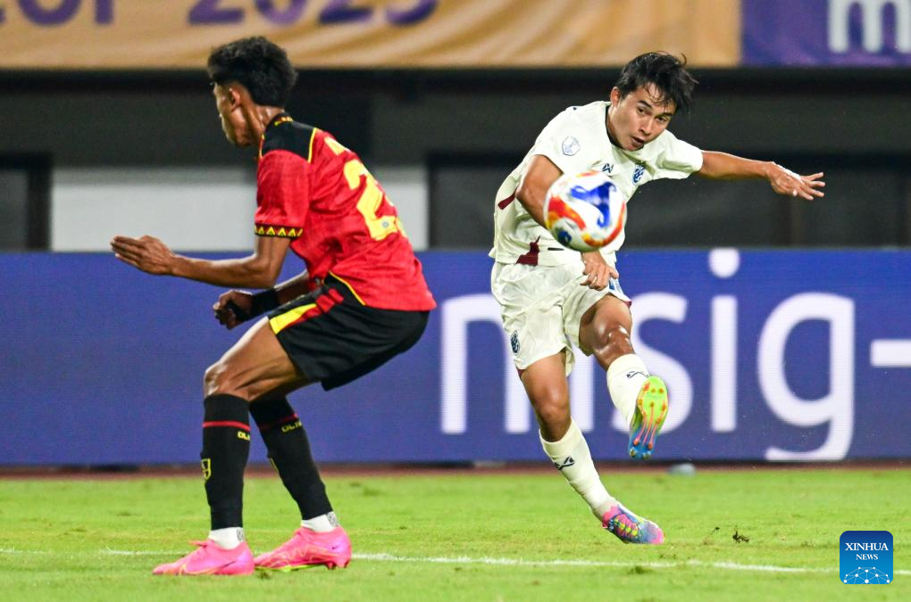 Yotsakon Burapha (C) of Thailand vies with Olagar Fernando Malik Xavier of Timor-Leste during ASEAN Football Federation (AFF) U23 Championship 2025 Group C match between Timor-Leste and Thailand in Bekasi, Indonesia, on July 19, 2025. (Xinhua/Zulkarnain)