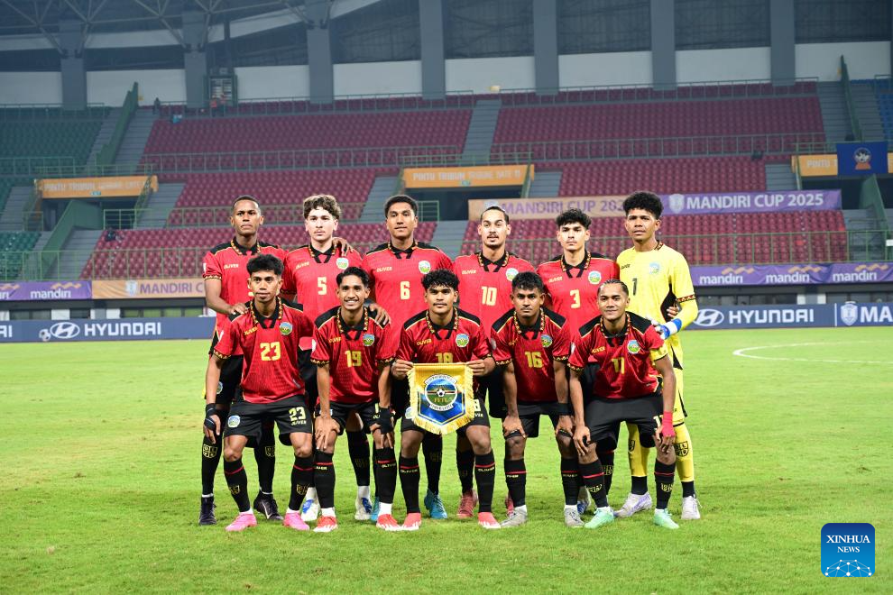 Players of Timor-Leste pose for a group photo before ASEAN Football Federation (AFF) U23 Championship 2025 Group C match between Timor-Leste and Thailand in Bekasi, Indonesia, on July 19, 2025. (Xinhua/Zulkarnain)