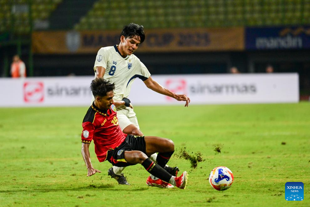 Seksan Ratree (R) of Thailand vies with Freteliano De Jesus Dos Santos of Timor-Leste during ASEAN Football Federation (AFF) U23 Championship 2025 Group C match between Timor-Leste and Thailand in Bekasi, Indonesia, on July 19, 2025. (Xinhua/Zulkarnain)