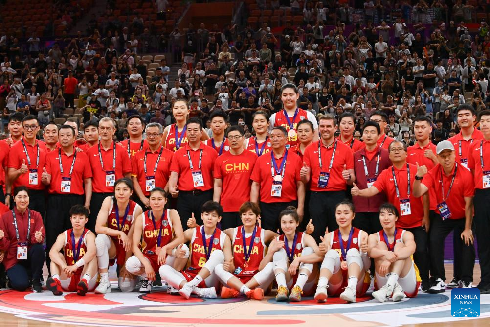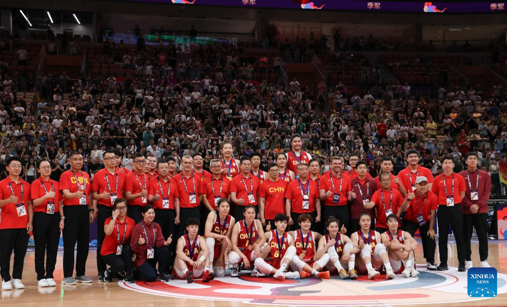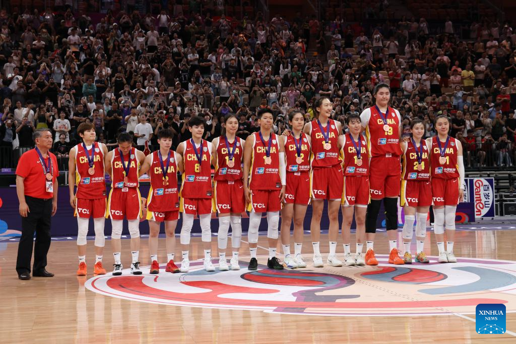 Members of China pose after the awarding ceremony of the 3rd place match between China and South Korea at the FIBA Women's Asia Cup 2025 in Shenzhen, south China's Guangdong Province, July 20, 2025. (Xinhua/Mao Siqian)