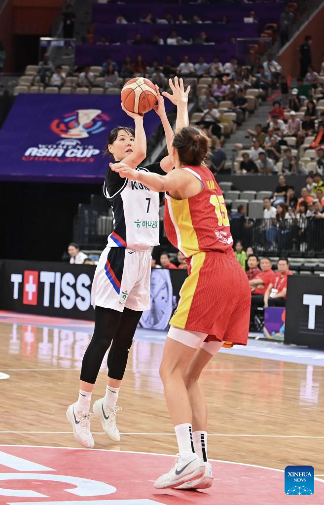 Park Jisu (L) of South Korea shoots during the 3rd place match between China and South Korea at the FIBA Women's Asia Cup 2025 in Shenzhen, south China's Guangdong Province, July 20, 2025. (Xinhua/Xiao Ennan)