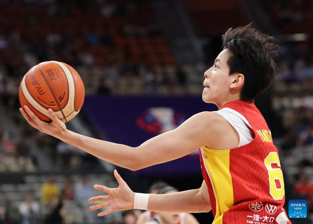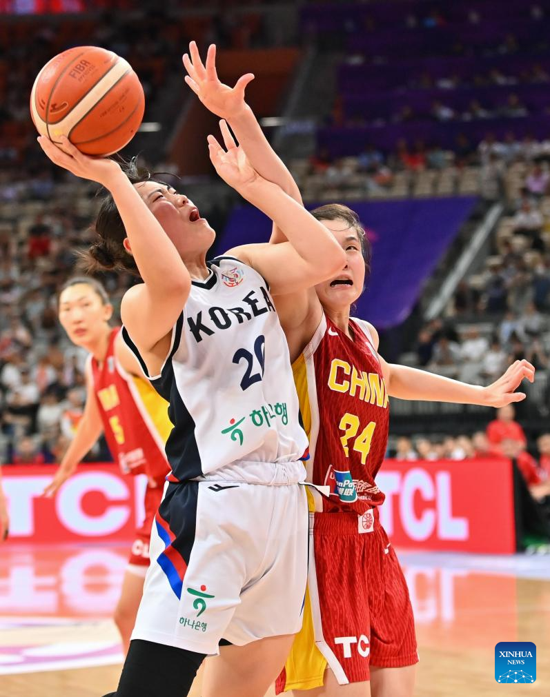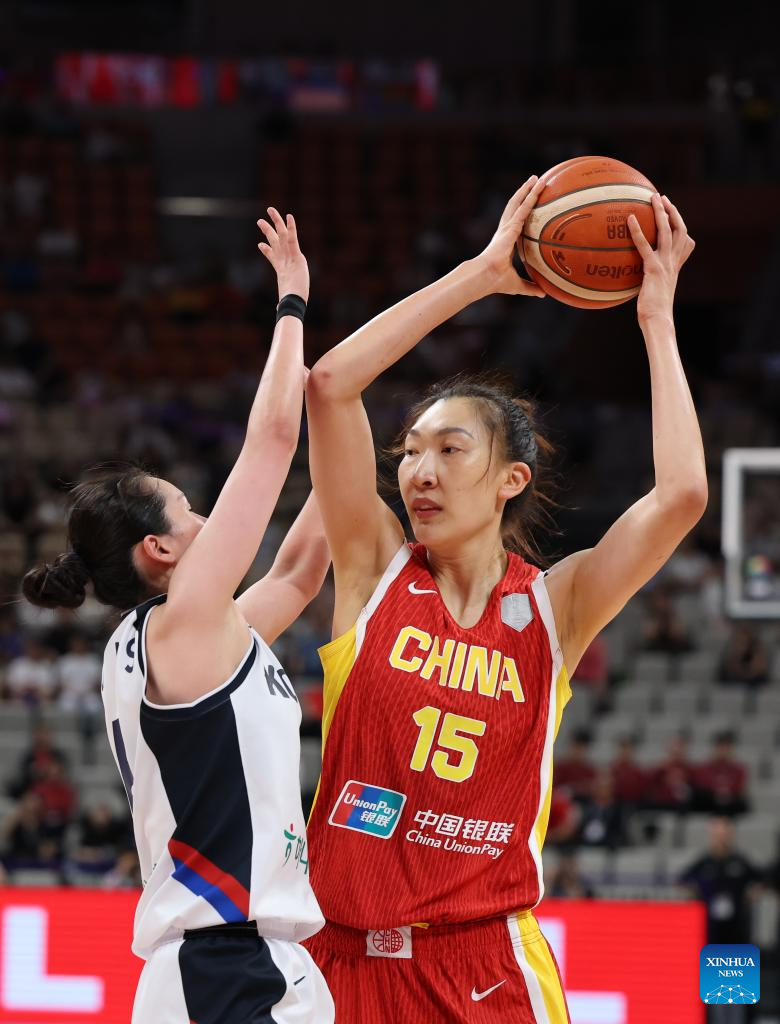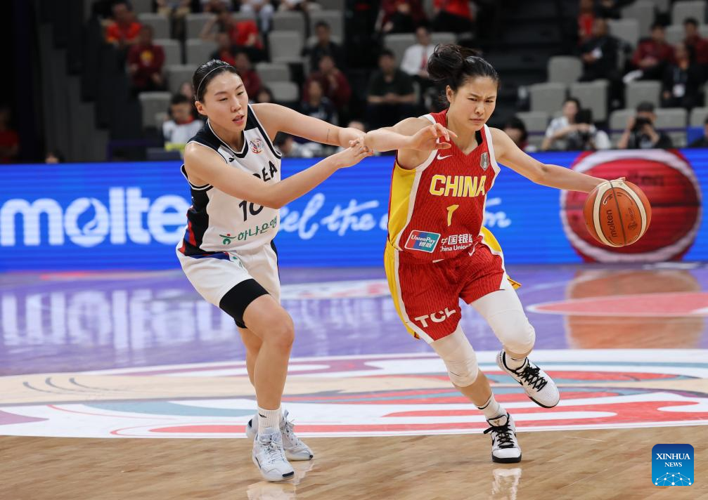 Han Xu (R) of China competes during the 3rd place match between China and South Korea at the FIBA Women's Asia Cup 2025 in Shenzhen, south China's Guangdong Province, July 20, 2025. (Xinhua/Liang Xu)