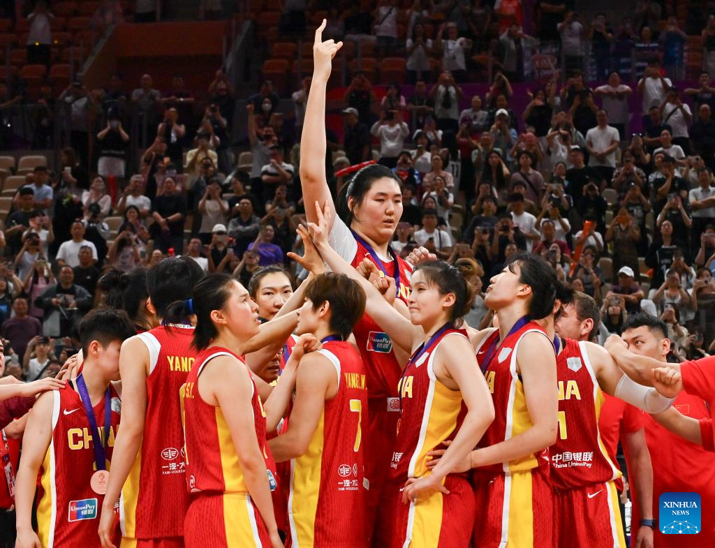 Members of China celebrate after the awarding ceremony of the 3rd place match between China and South Korea at the FIBA Women's Asia Cup 2025 in Shenzhen, south China's Guangdong Province, July 20, 2025. (Xinhua/Mao Siqian)