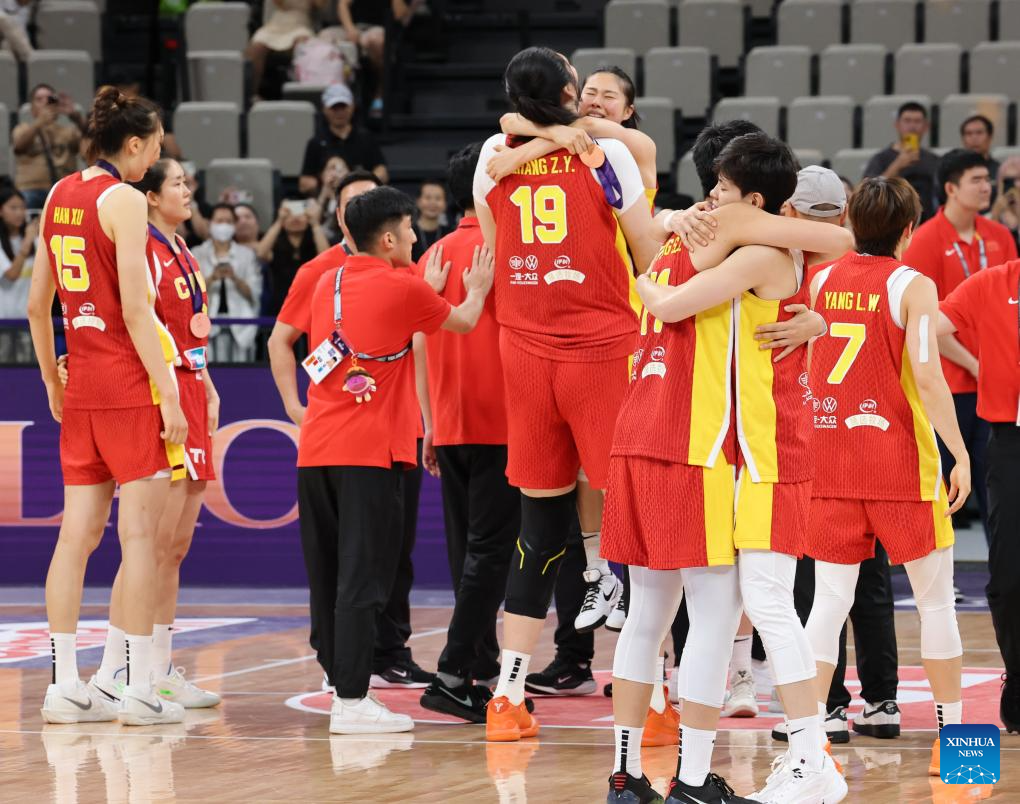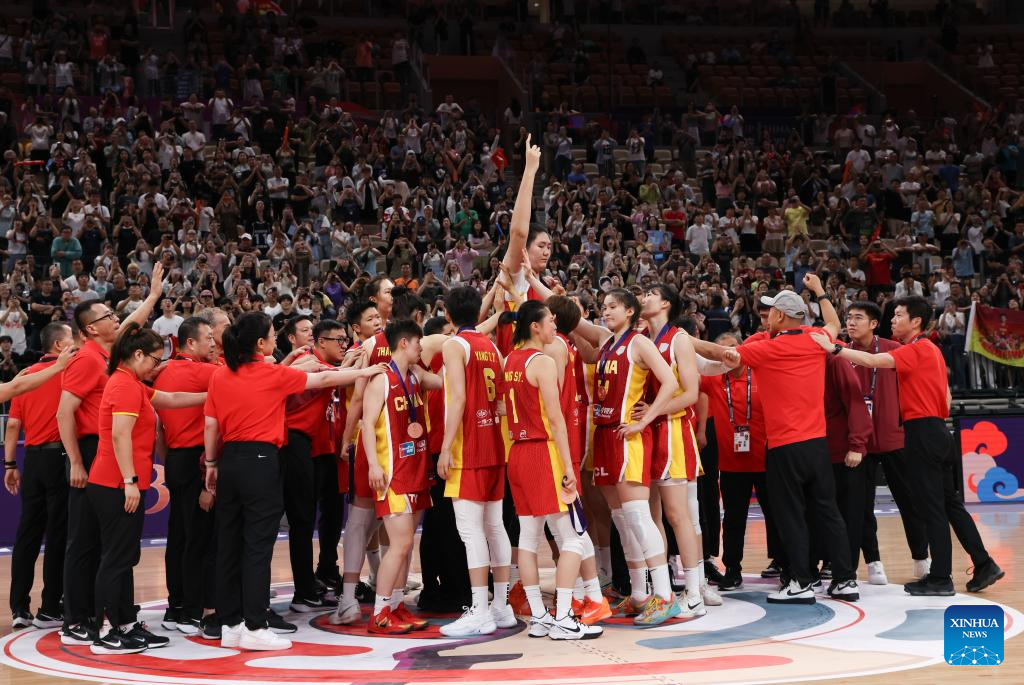 Members of China celebrate after the awarding ceremony of the 3rd place match between China and South Korea at the FIBA Women's Asia Cup 2025 in Shenzhen, south China's Guangdong Province, July 20, 2025. (Xinhua/Xiao Ennan)