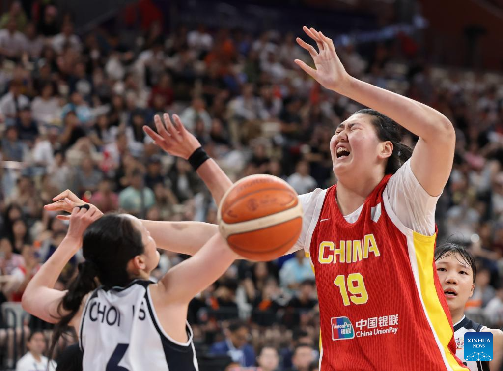 Zhang Ziyu (2nd R) of China competes during the 3rd place match between China and South Korea at the FIBA Women's Asia Cup 2025 in Shenzhen, south China's Guangdong Province, July 20, 2025. (Xinhua/Liang Xu)