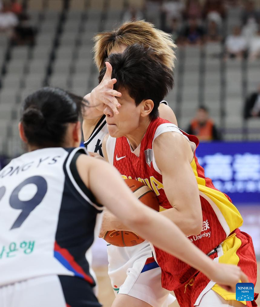 Yang Shuyu (R) of China breaks through during the 3rd place match between China and South Korea at the FIBA Women's Asia Cup 2025 in Shenzhen, south China's Guangdong Province, July 20, 2025. (Xinhua/Liang Xu)