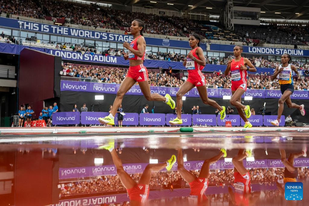 Medina Eisa (R) of Ethiopia crosses the line to win the women's 5000m event at the 2025 Diamond League London Meeting in London, Britain, July 19, 2025. (Photo by Stephen Chung/Xinhua)