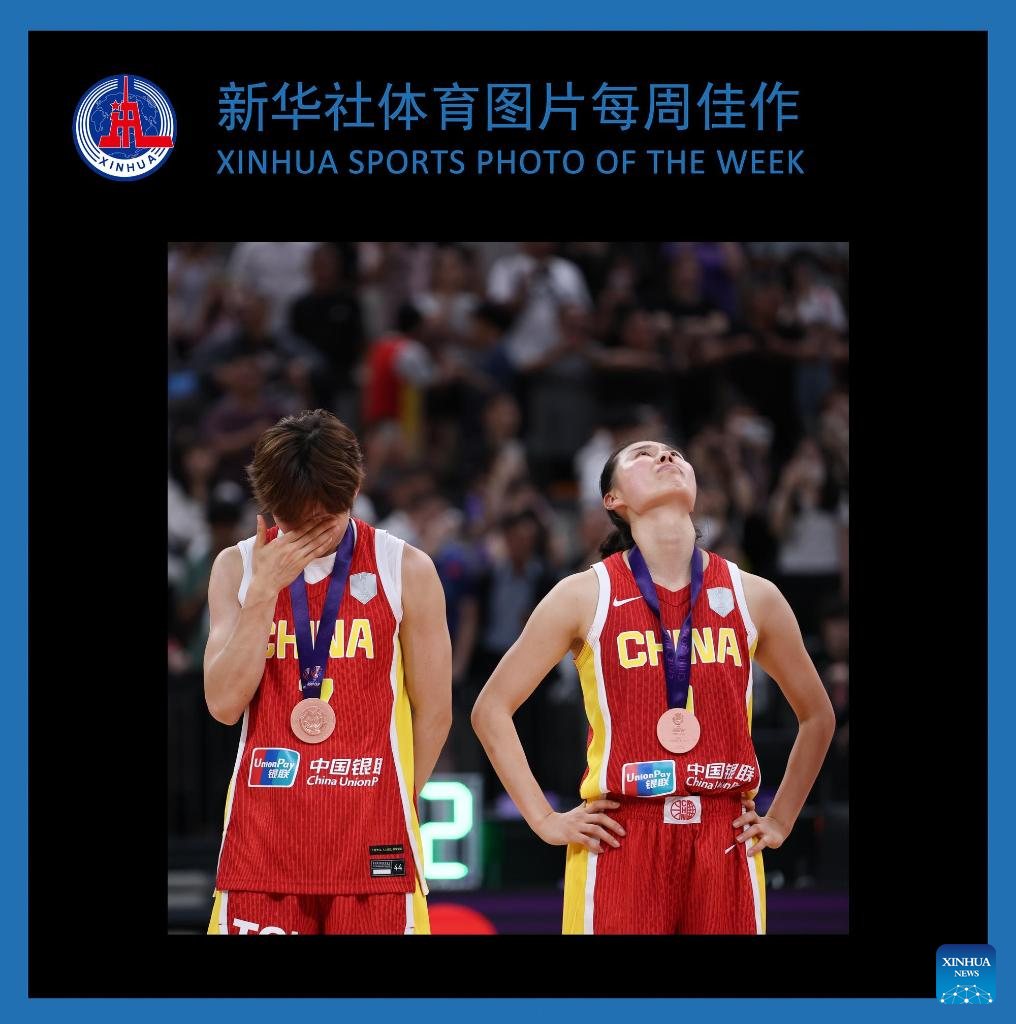 Wang Siyu (R) and Yang Liwei of China react during the awarding ceremony after the 3rd place match between China and South Korea at the FIBA Women's Asia Cup 2025 in Shenzhen, south China's Guangdong Province, July 20, 2025. (Xinhua/Mao Siqian)