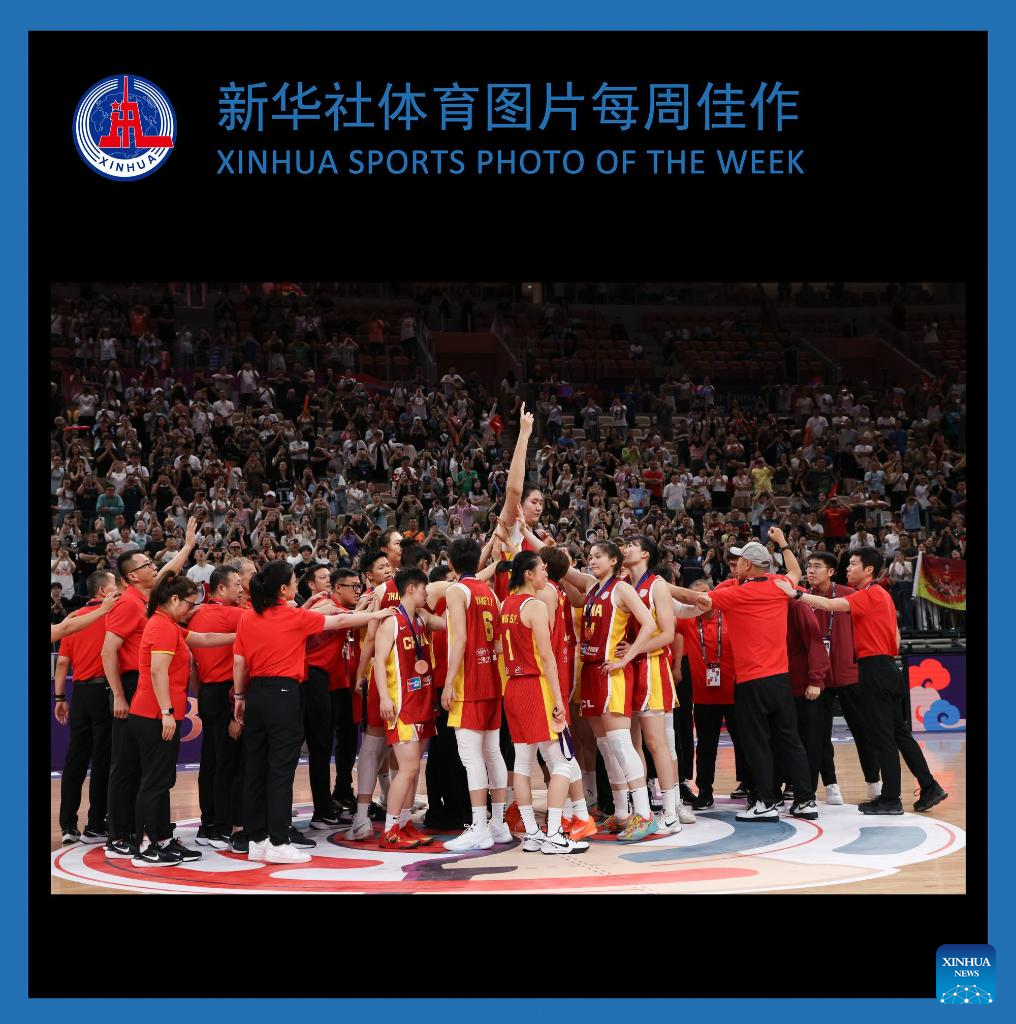 Members of Team China celebrate after the awarding ceremony of the 3rd place match between China and South Korea at the FIBA Women's Asia Cup 2025 in Shenzhen, south China's Guangdong Province, July 20, 2025. (Xinhua/Mao Siqian)