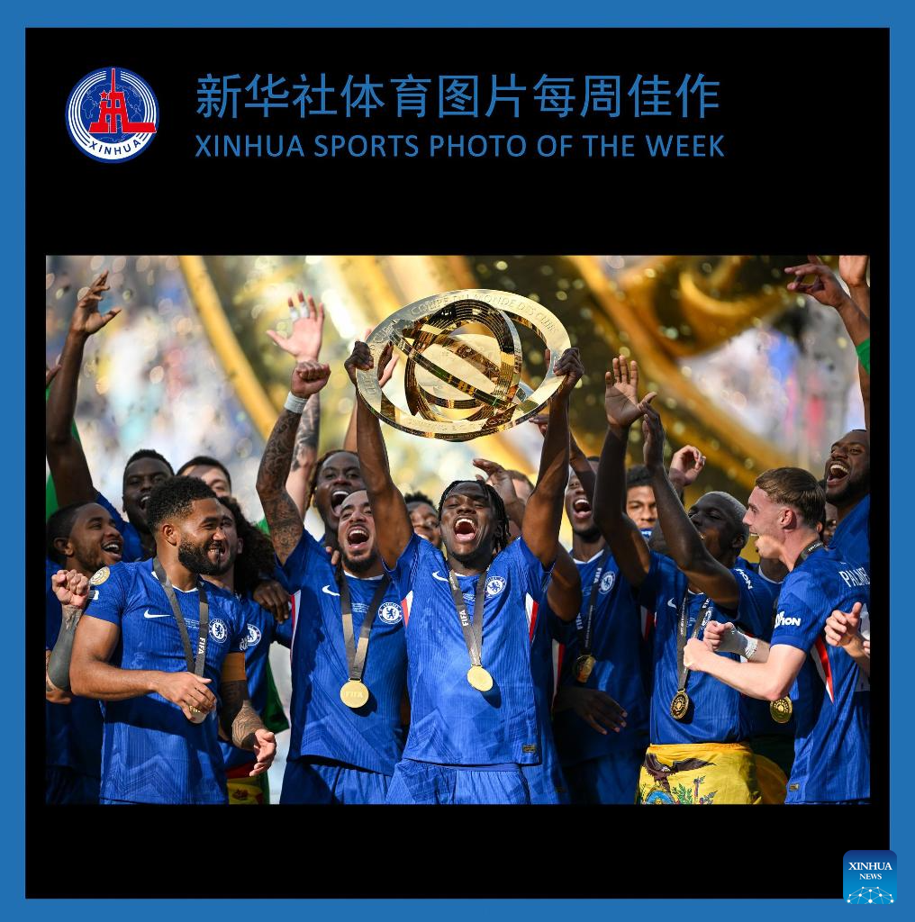 Players of Chelsea FC celebrate with trophy during the awarding ceremony for the final match between Chelsea FC (England) and Paris Saint-Germain (France) at the FIFA Club World Cup 2025 at the MetLife Stadium, New Jersey, the United States, July 13, 2025. (Xinhua/Wu Xiaoling)
