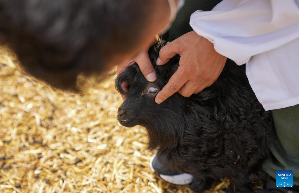 A staff member examines a black goat at a breeding base in Banbar County of Qamdo City, southwest China's Xizang Autonomous Region, July 20, 2025.