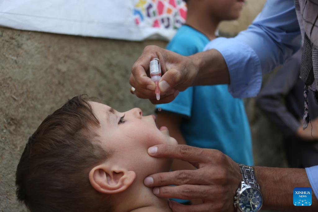 An Afghan child receives a dose of polio vaccine during a polio vaccination campaign in Kabul, Afghanistan, on July 21, 2025. The Afghan interim government's Ministry of Public Health on Monday announced a four-day vaccination campaign aimed at protecting 7.3 million children under the age of five from poliovirus. (Photo by Saifurahman Safi/Xinhua)