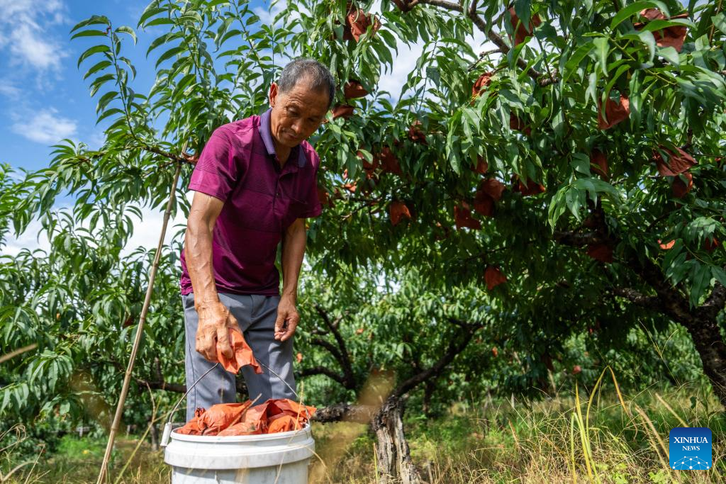 A farmer picks yellow peaches at an orchard in Shiziba Village of Yanling County, Zhuzhou, central China's Hunan Province, July 21, 2025. Yellow peaches in Yanling County have entered harvest season. Yellow peach is the characteristic industry of Yanling, which boasts a planting area of about 96,000 mu (6400 hectares) with an expected output of 85,000 tonnes this year. (Xinhua/Chen Sihan)