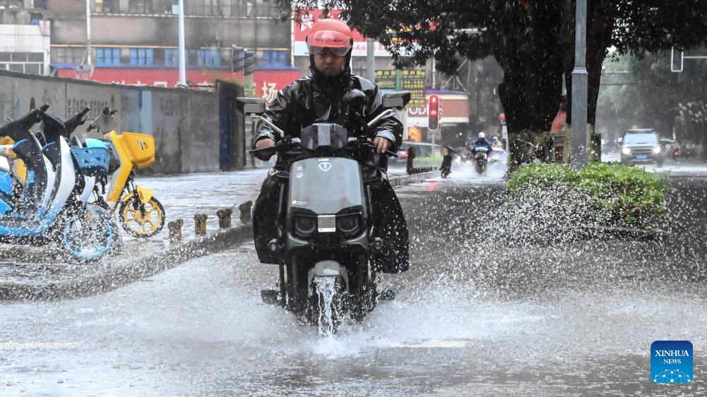 A man rides a motorcycle in the rain in Qinzhou, south China's Guangxi Zhuang Autonomous Region, July 21, 2025.