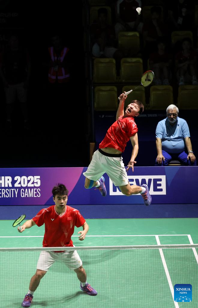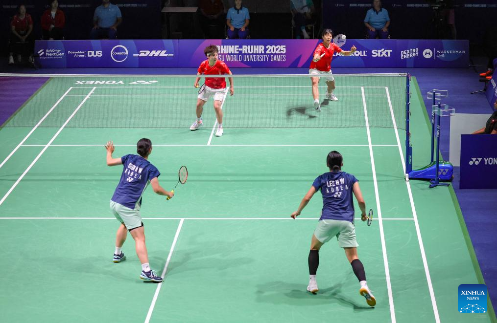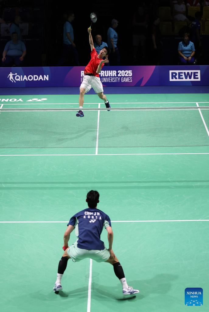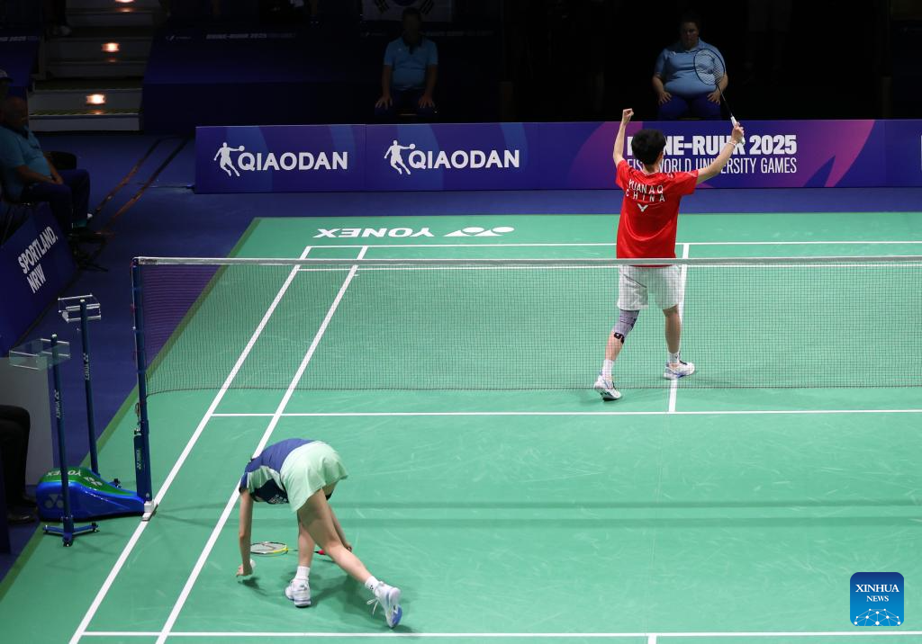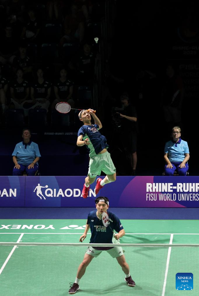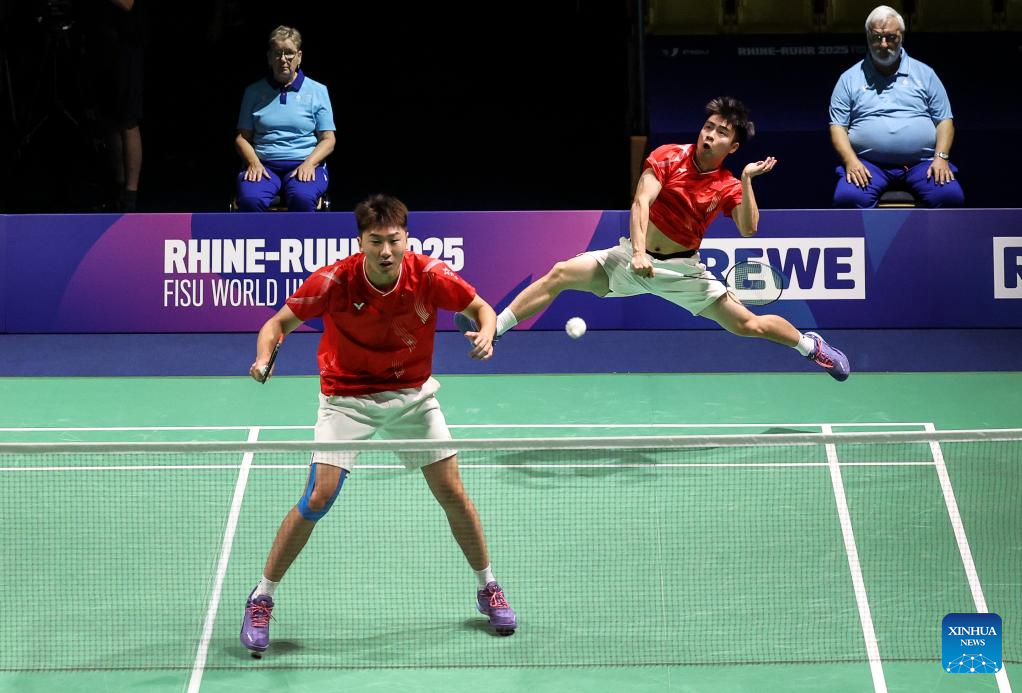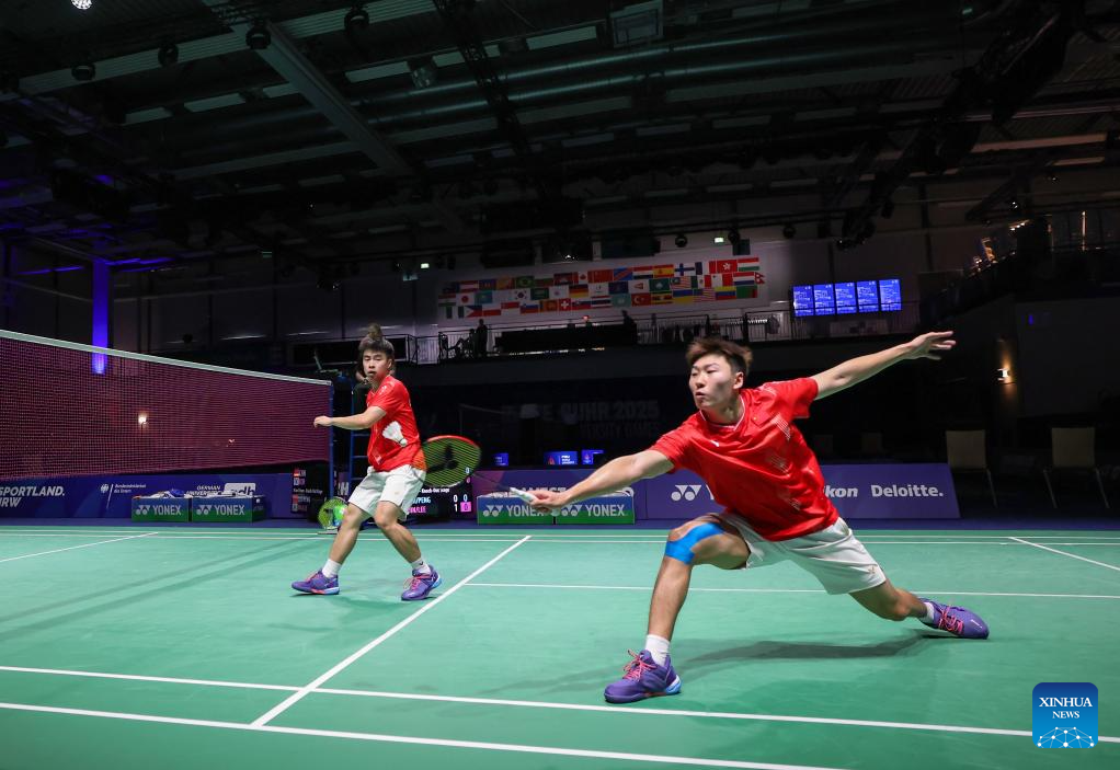 Cui Hechen (R)/Peng Jianqin of China compete during the badminton mixed team semifinal match between China and South Korea at the Rhine-Ruhr 2025 FISU World University Games in Muelheim, Germany, July 20, 2025. (Xinhua/Hu Xingyu)