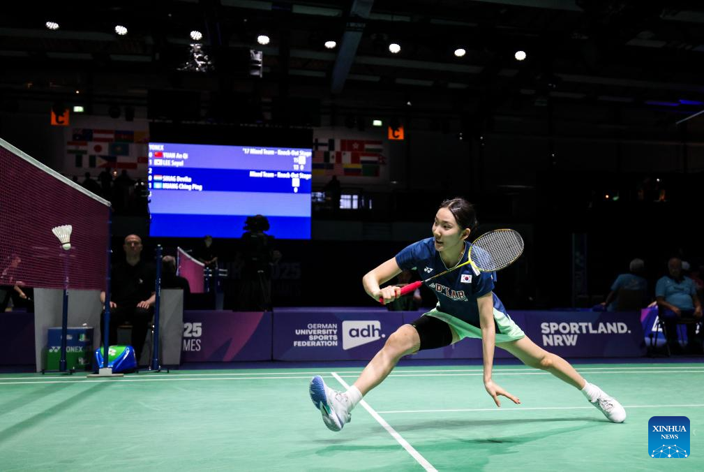 Lee Soyul of South Korea competes during the badminton mixed team semifinal match between China and South Korea at the Rhine-Ruhr 2025 FISU World University Games in Muelheim, Germany, July 20, 2025. (Xinhua/Hu Xingyu)