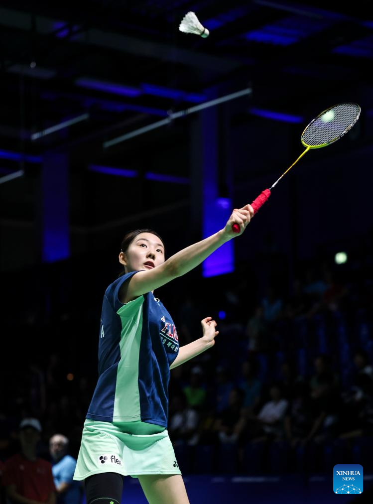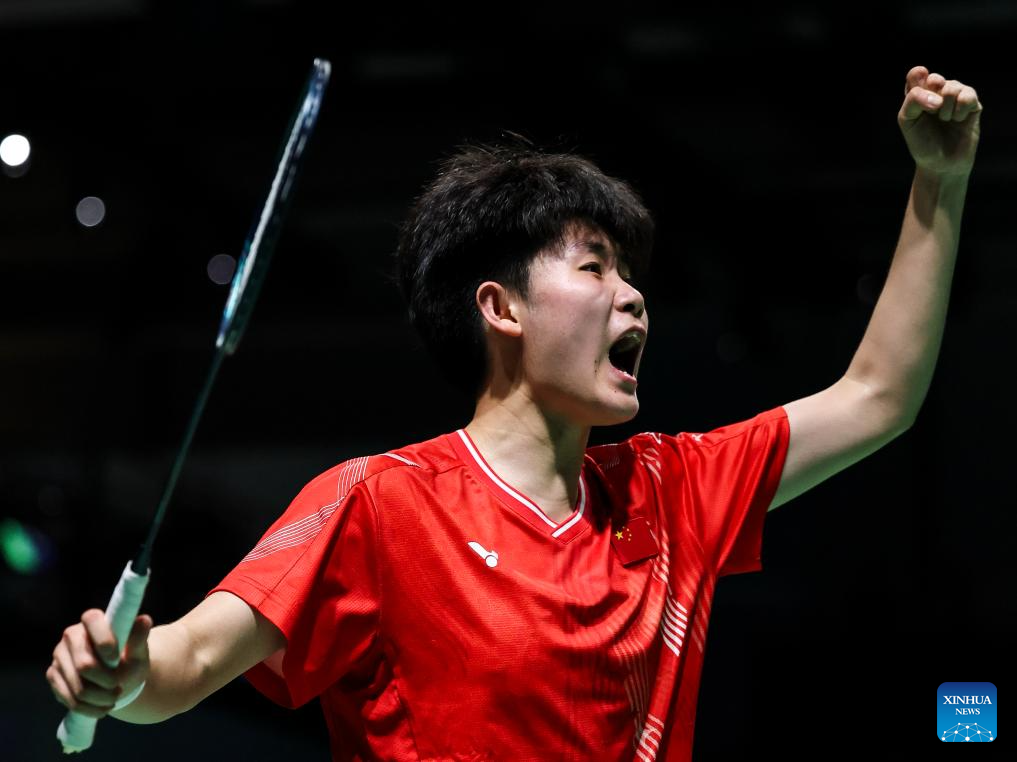 Yuan Anqi of China celebrates scoring during the badminton mixed team semifinal match between China and South Korea at the Rhine-Ruhr 2025 FISU World University Games in Muelheim, Germany, July 20, 2025. (Xinhua/Hu Xingyu)