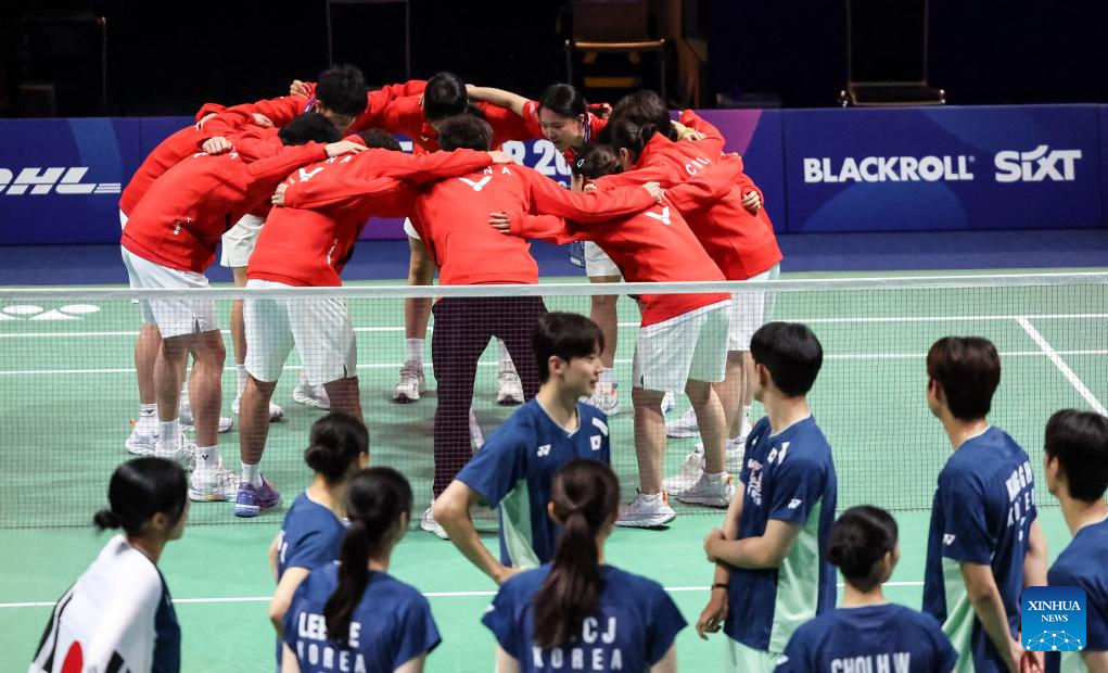 Team China cheer up before the badminton mixed team semifinal match between China and South Korea at the Rhine-Ruhr 2025 FISU World University Games in Muelheim, Germany, July 20, 2025. (Xinhua/Hu Xingyu)