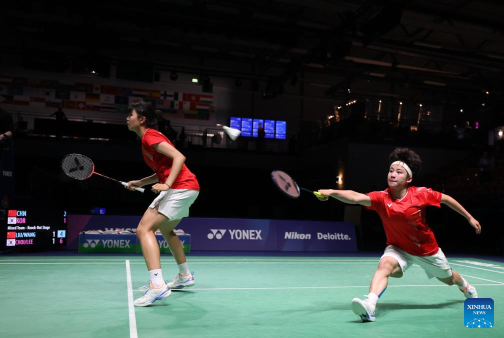 Liu Jiayue (L top)/Wang Yiduo of China compete during the badminton mixed team semifinal match between China and South Korea at the Rhine-Ruhr 2025 FISU World University Games in Muelheim, Germany, July 20, 2025. (Xinhua/Zhang Fan)