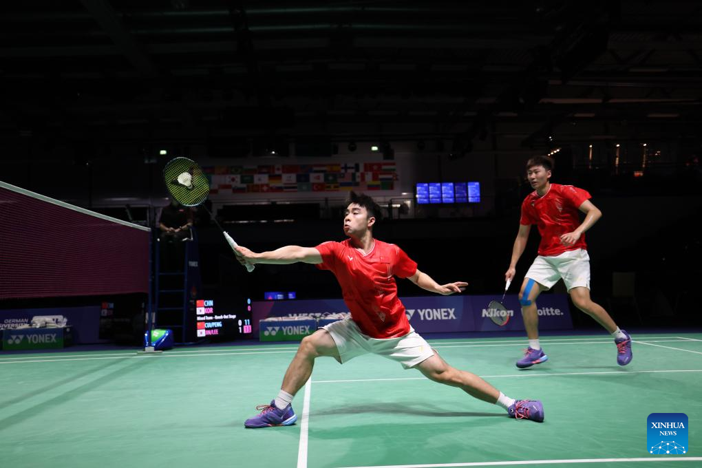 Cui Hechen (R)/Peng Jianqin of China compete during the badminton mixed team semifinal match between China and South Korea at the Rhine-Ruhr 2025 FISU World University Games in Muelheim, Germany, July 20, 2025. (Xinhua/Zhang Fan)
