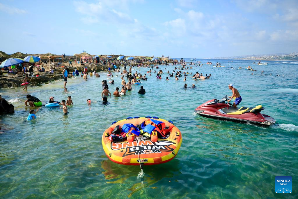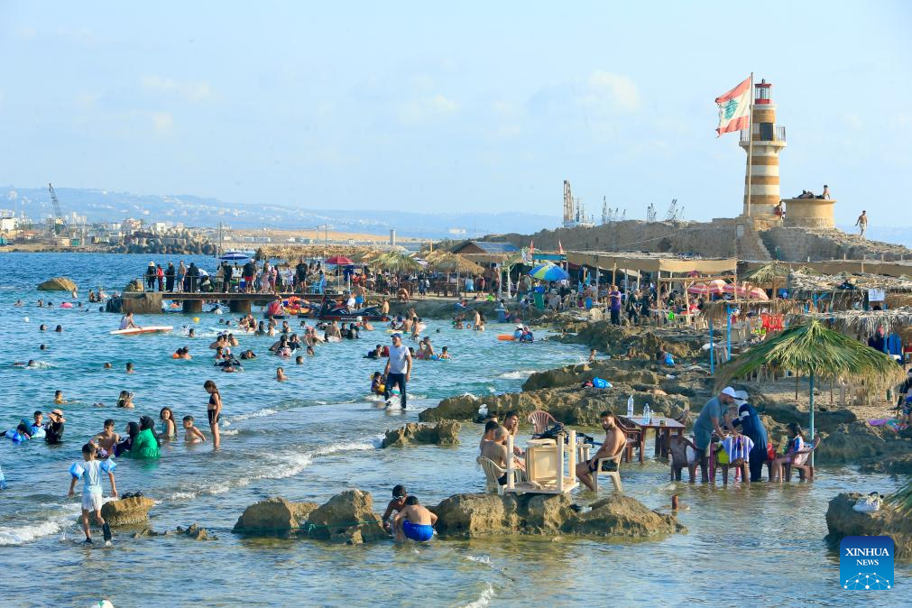 People enjoy a moment of fun and relief from the summer heat on a small island off the coast of Sidon, Lebanon, July 20, 2025. (Photo by Ali Hashisho/Xinhua)