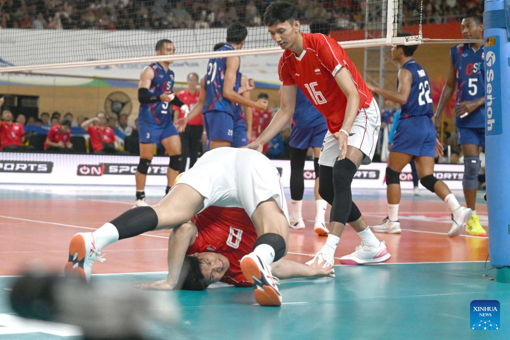 Jasen Natanael Kilanta (Bottom) of Indonesia falls down during the match between Indonesia and Thailand in the 2nd leg of the Men's SEA Volleyball League in Jakarta, Indonesia, July 20, 2025. (Xinhua/Agung Kuncahya B.)