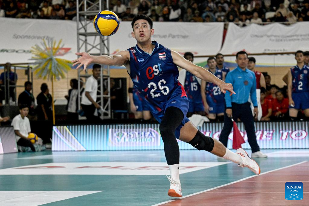 Chaiwat Thungkham of Thailand saves the ball during the match between Indonesia and Thailand in the 2nd leg of the Men's SEA Volleyball League in Jakarta, Indonesia, July 20, 2025. (Xinhua/Agung Kuncahya B.)