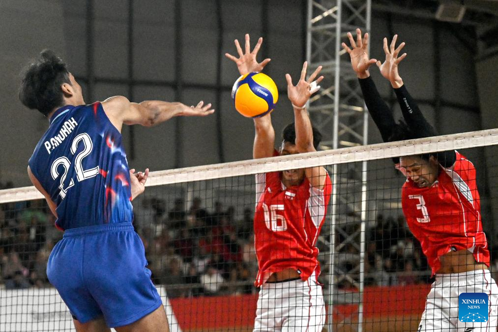 Anurak Phanram (L) of Thailand spikes the ball during the match between Indonesia and Thailand in the 2nd leg of the Men's SEA Volleyball League in Jakarta, Indonesia, July 20, 2025. (Xinhua/Agung Kuncahya B.)