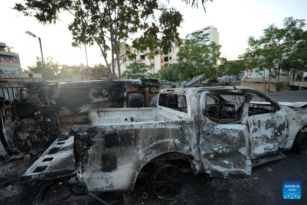 Burned vehicles are seen following a conflict between Druze fighters and Bedouin tribal militants on the streets of Sweida city, southern Syria, July 17, 2025. A ceasefire agreement brokered in southern Syria has brought a fragile calm to Sweida province after eight days of intense fighting, with human rights groups reporting the full implementation of the deal on Monday. (Str/Xinhua)