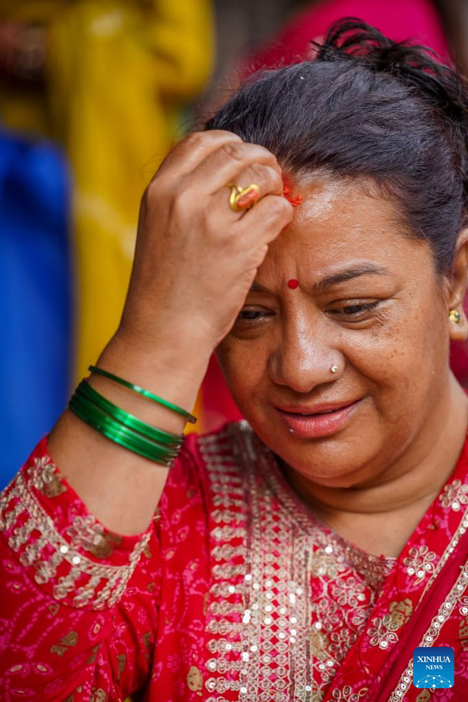 A devotee puts tika on the forehead following a worship ritual on the first Monday of the holy month of Shrawan in Lalitpur, Nepal, July 21, 2025. (Photo by Hari Maharjan/Xinhua)