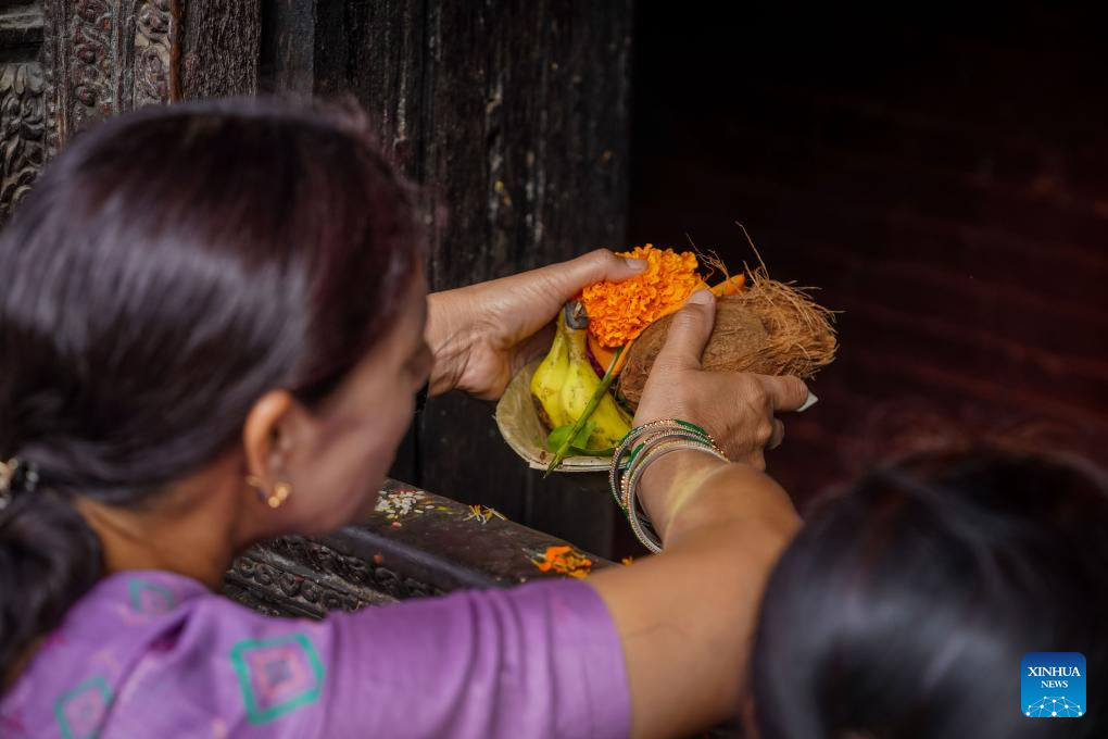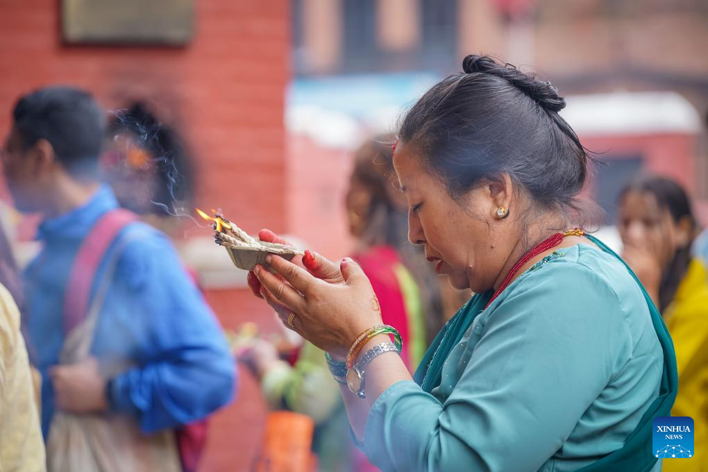 A devotee makes offerings to Lord Shiva on the first Monday of the holy month of Shrawan in Lalitpur, Nepal, July 21, 2025. (Photo by Hari Maharjan/Xinhua)