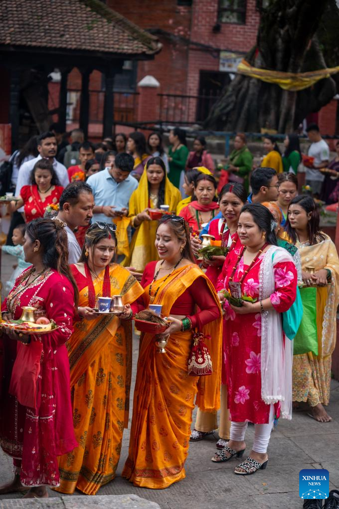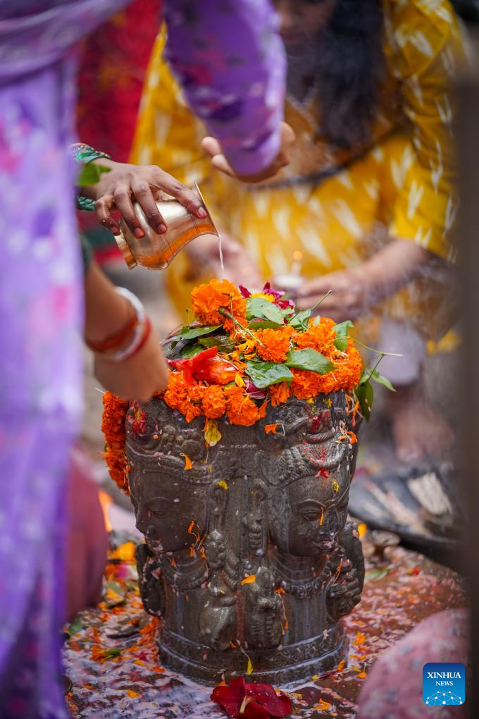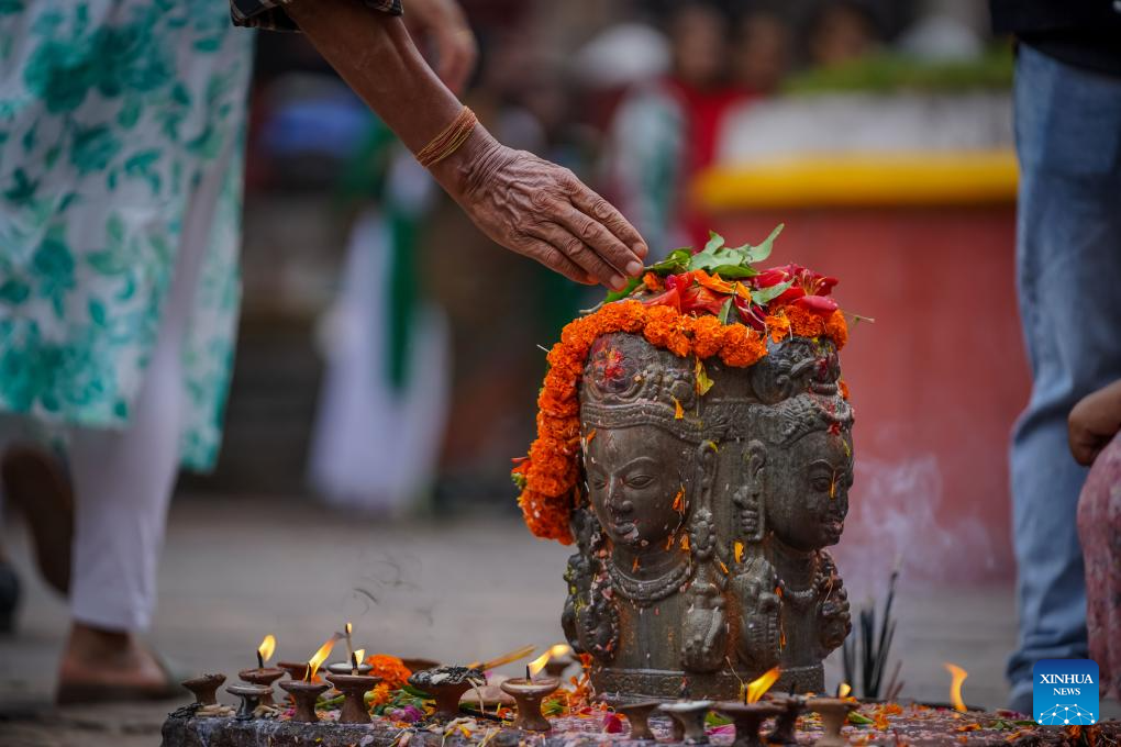Devotees make offerings to Lord Shiva on the first Monday of the holy month of Shrawan in Lalitpur, Nepal, July 21, 2025. (Photo by Hari Maharjan/Xinhua)