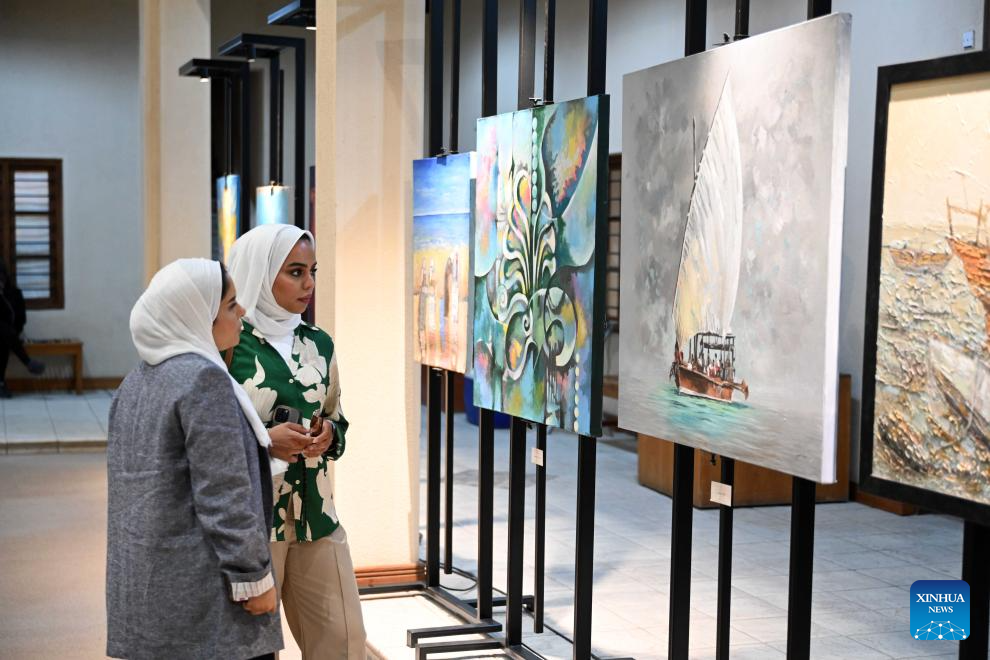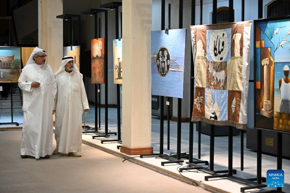 People visit the "Kuwait Antiquities in Colors" exhibition in Kuwait City, Kuwait, July 21, 2025. Kuwait's National Council for Culture, Arts, and Letters held the summer art exhibition with 38 artworks of 30 artists. The exhibition will last until July 27. (Photo by Asad/Xinhua)