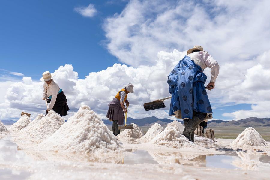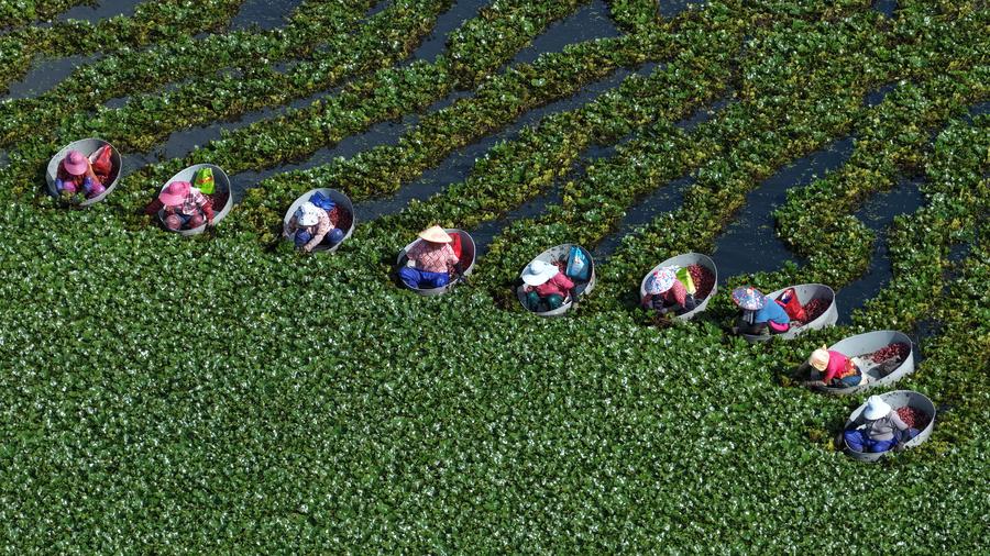 An aerial drone photo taken on July 21, 2025 shows villagers picking water chestnuts in Huai'an, east China's Jiangsu Province. (Photo by Yin Chao/Xinhua)Liu Lin (L) and her husband take care of potted succulent plants at the planting base of her company in Zhouning County, southeast China's Fujian Province, July 19, 2025. (Xinhua/Jiang Kehong)A farmer picks yellow peaches at an orchard in Shiziba Village of Yanling County, Zhuzhou, central China's Hunan Province, July 21, 2025. (Xinhua/Chen Sihan)Herdsmen harvest salt in Gegye County of Ngari Prefecture, southwest China's Xizang Autonomous Region, July 20, 2025. (Xinhua/Tenzing Nima Qadhup)Lin Yanhan/Lin Yanjun of China perform during the women's duet technical final of artistic swimming at the World Aquatic Championships in Singapore, July 21, 2025. (Xinhua/Xia Yifang)People dive into the sea off the coast of Sidon, Lebanon, July 20, 2025. (Photo by Ali Hashisho/Xinhua)Construction workers inspect in the Lower Intake pipeline of the Polihali Transfer Tunnel Project in Mokhotlong District, eastern Lesotho, July 6, 2025. (Xinhua/Yang Guang)Palestinians wait to receive food in the Al-Rimal neighborhood of central Gaza City, on July 20, 2025. The total death toll of hunger in Gaza since March has reached 86, including 76 children, the Gaza-based health authorities said Sunday. (Photo by Rizek Abdeljawad/Xinhua)■