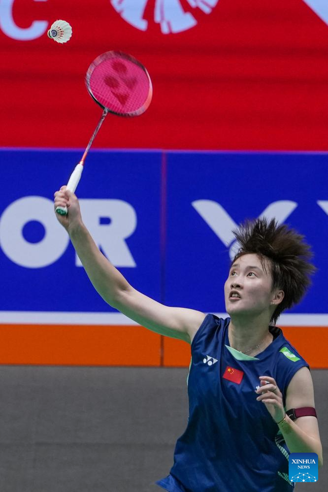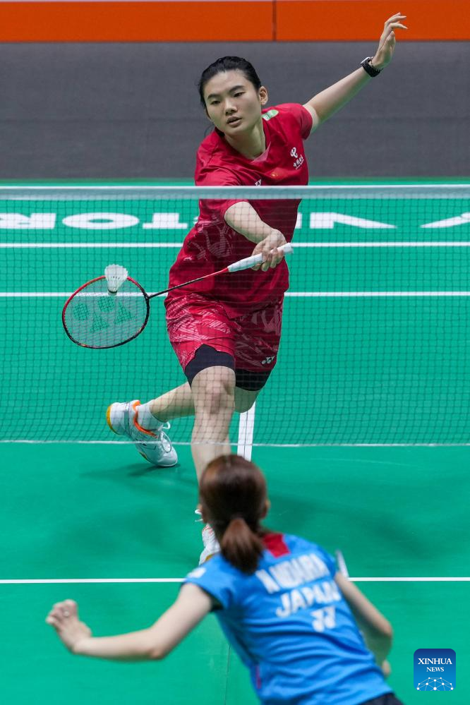Han Yue of China competes during the women's singles round of 32 match between Han Yue of China and Nidaira Natsuki of Japan at the China Open 2025 badminton tournament in Changzhou, east China's Jiangsu Province, July 22, 2025. (Xinhua/Li Bo)