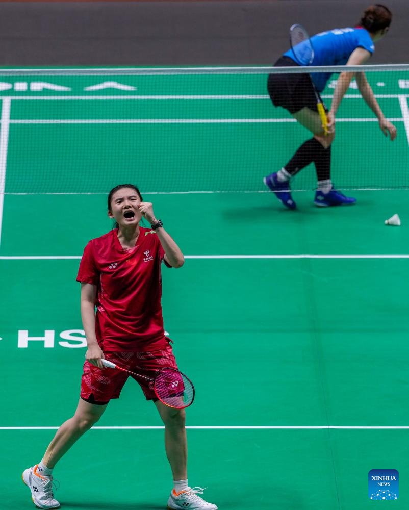 Guo Xinwa/Chen Fanghui (R) of China compete during the mixed doubles round of 32 match between Guo Xinwa/Chen Fanghui of China and Jesper Toft/Amalie Magelund of Denmark at the China Open 2025 badminton tournament in Changzhou, east China's Jiangsu Province, July 22, 2025. (Xinhua/Li Bo)