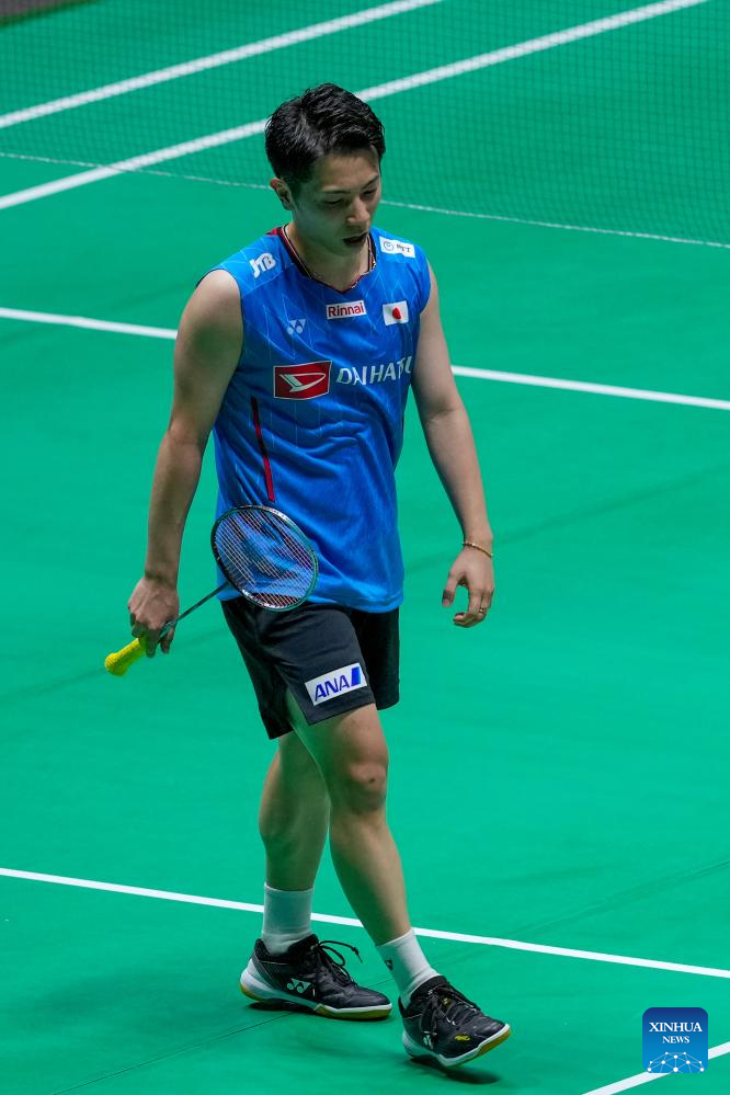 Kunlavut Vitidsarn of Thailand reacts during the men's singles round of 32 match between Kunlavut Vitidsarn of Thailand and Alwi Farhan of Indonesia at the China Open 2025 badminton tournament in Changzhou, east China's Jiangsu Province, July 22, 2025. (Xinhua/Li Bo)