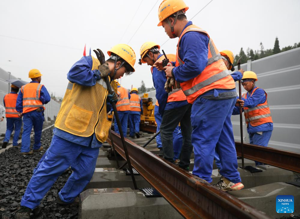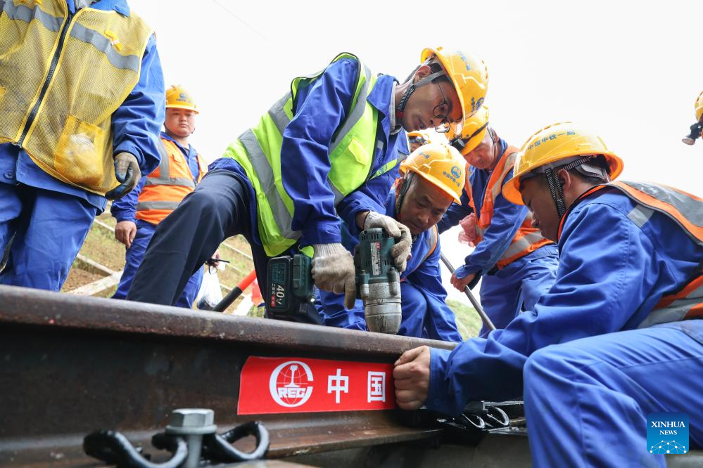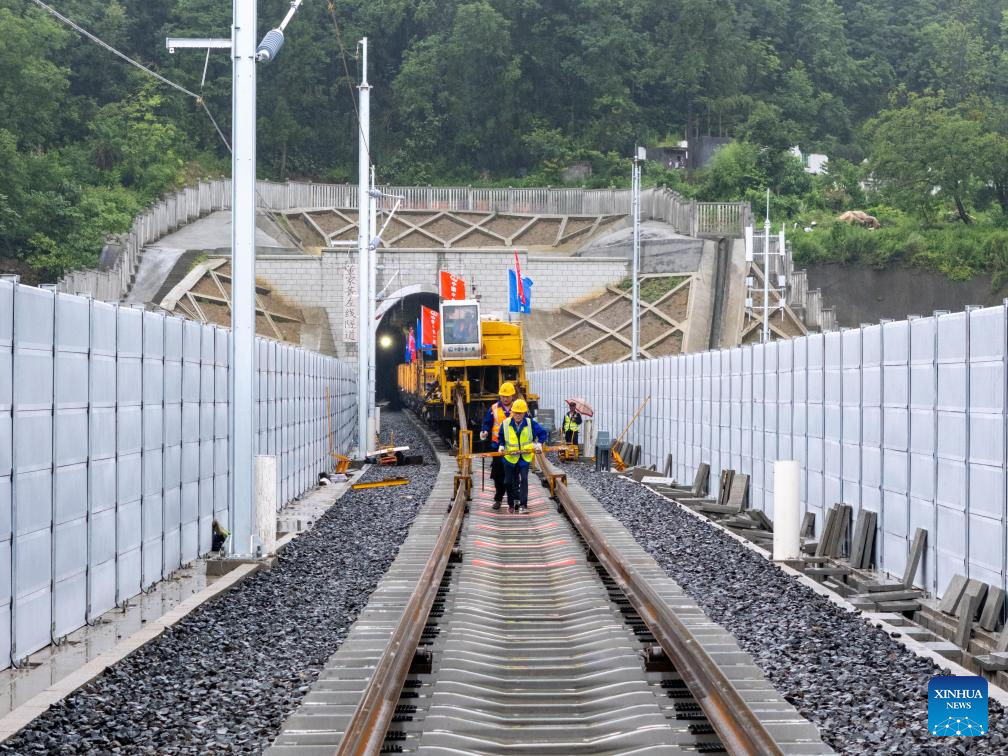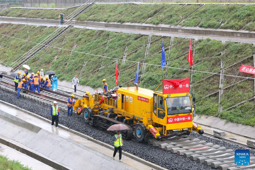 Workers lay railway tracks in Panzhou, southwest China's Guizhou Province, July 22, 2025. With the last 500-meter-long steel rail laid on the roadbed in Panzhou City, the Panzhou to Xingyi high-speed railway's track laying work has been completed on Tuesday. The 98-kilometer railway is expected to open to traffic by the end of 2025, enabling a direct connection from Guiyang to Xingyi within two hours. (Xinhua/Liu Xu)