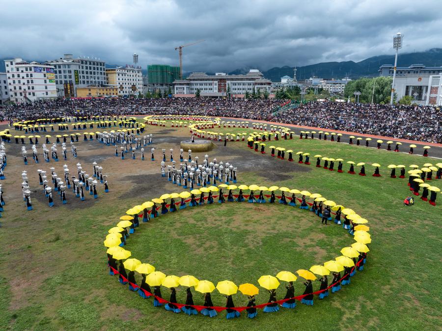 An aerial drone photo taken on July 22, 2025 shows a scene at the opening ceremony of a torch festival in Butuo County, southwest China's Sichuan Province. (Xinhua/Jiang Hongjing)