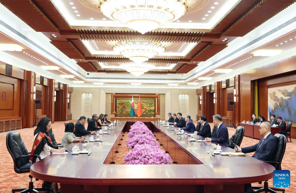 Wang Huning, chairman of the National Committee of the Chinese People's Political Consultative Conference (CPPCC), meets with Richard Ravalomanana, president of the Senate of Madagascar, in Beijing, capital of China, July 22, 2025. (Xinhua/Liu Bin)
