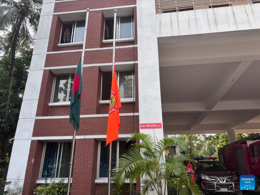 This photo taken on July 22, 2025 shows flags lowered to half-mast outside a fire service and civil defense station in Dhaka, Bangladesh. The death toll from Monday's crash of a Bangladesh Air Force training aircraft hit 31 on Tuesday, the Inter Service Public Relations (ISPR) of the Bangladesh Army said in a statement.