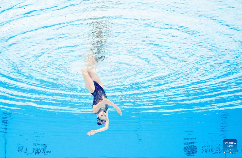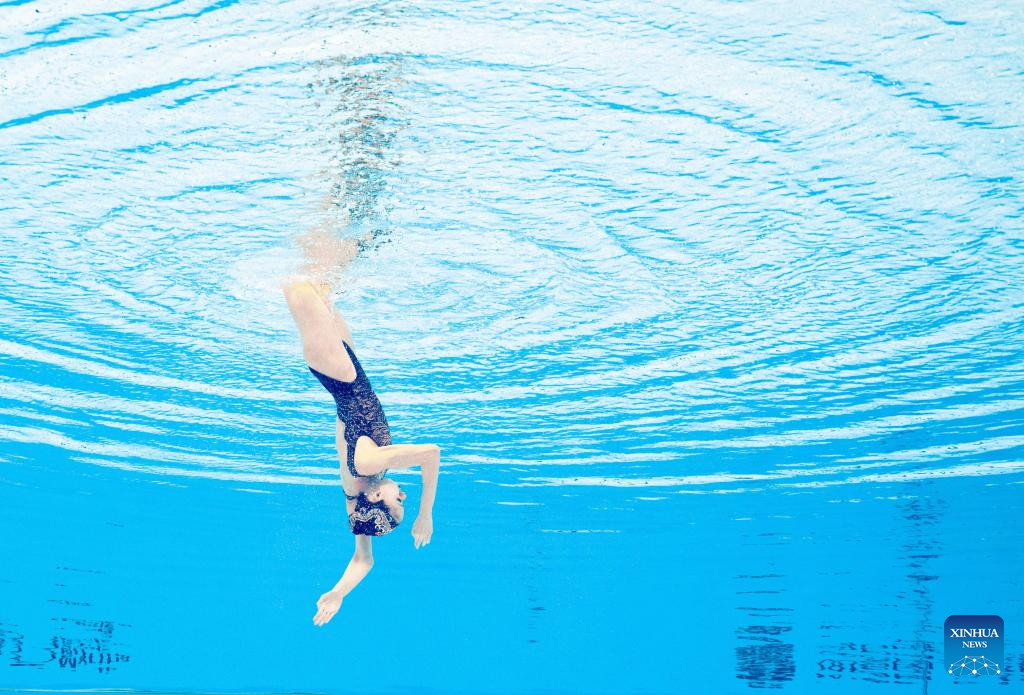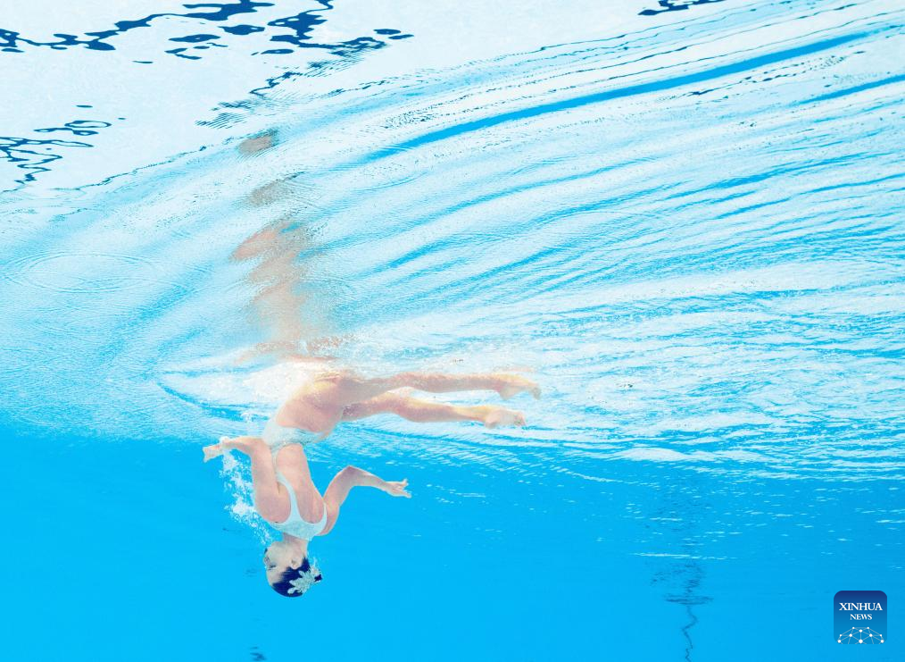 Photo rotated 180 degrees shows Iris Tio Casas of Spain performing during the women's solo free final of artistic swimming at the World Aquatics Championships in Singapore, July 22, 2025. (Xinhua/Xue Yuge)