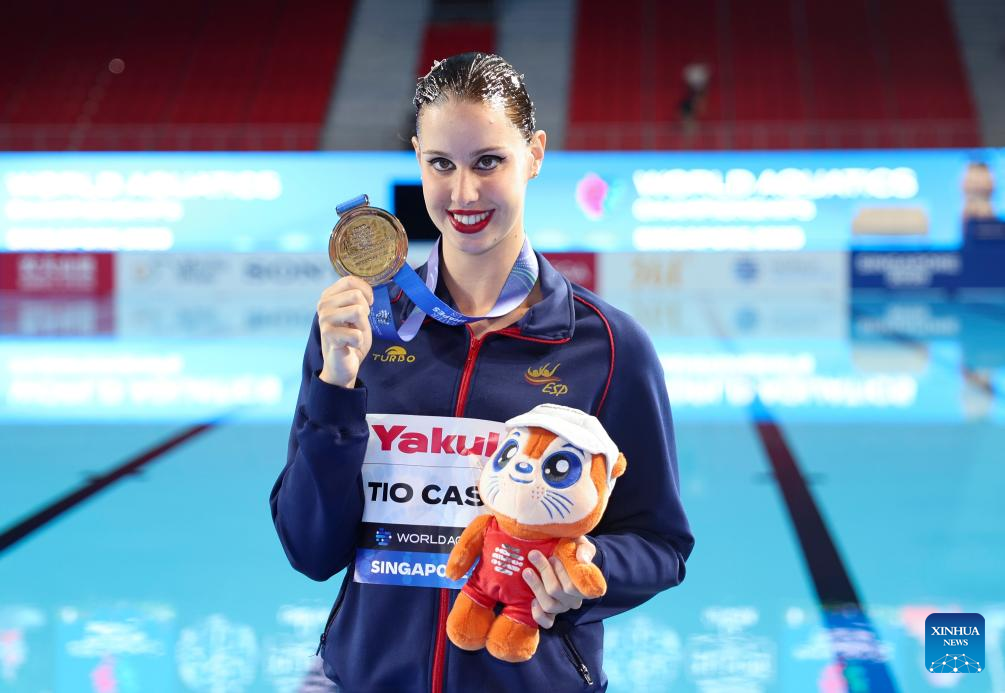 Iris Tio Casas of Spain poses with the medal after the women's solo free final of artistic swimming at the World Aquatics Championships in Singapore, July 22, 2025. (Xinhua/Luo Yuan)