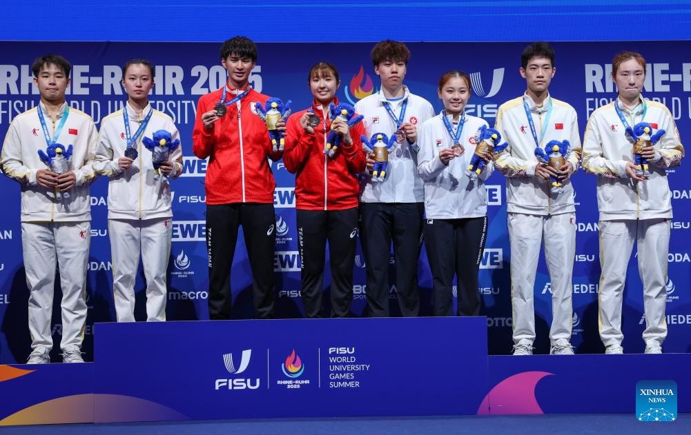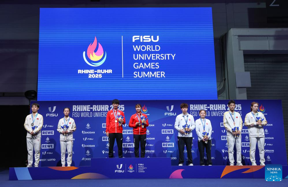 Photo taken on July 22, 2025 shows the awarding ceremony of the table tennis mixed doubles event at the Rhine-Ruhr 2025 FISU World University Games in Essen, Germany. (Xinhua/Zhang Fan)