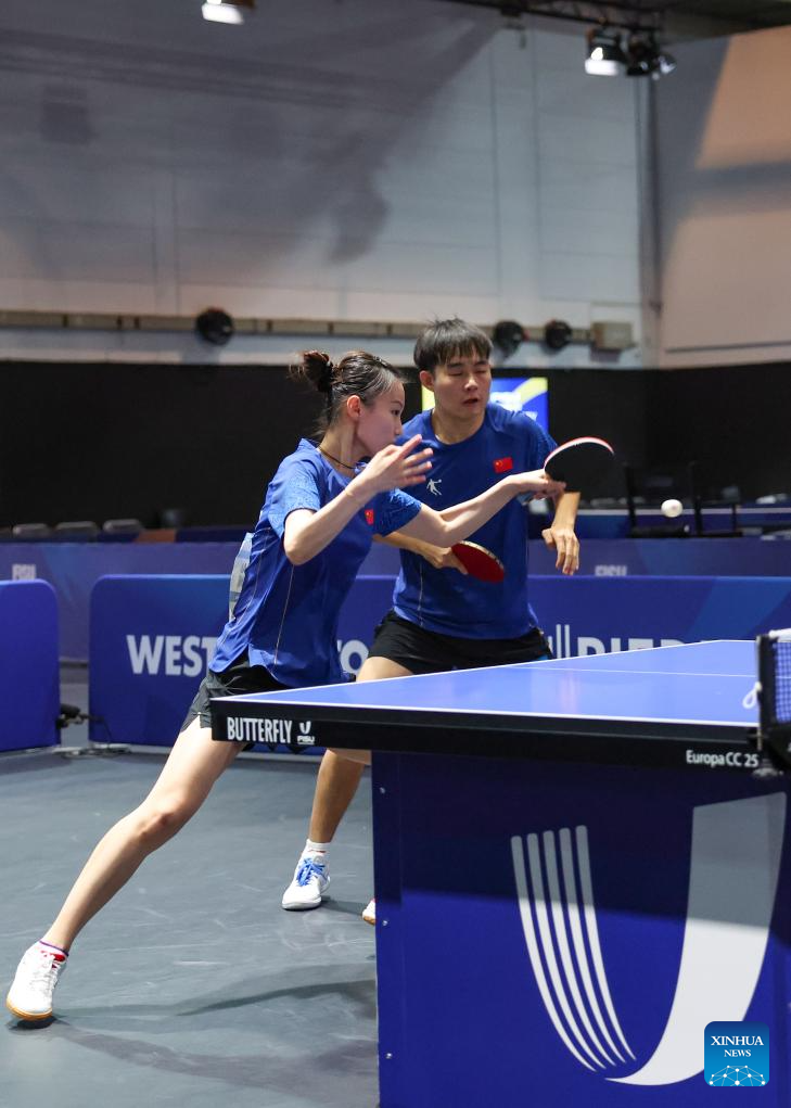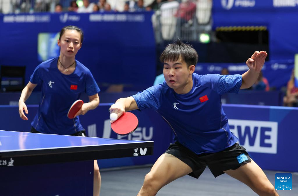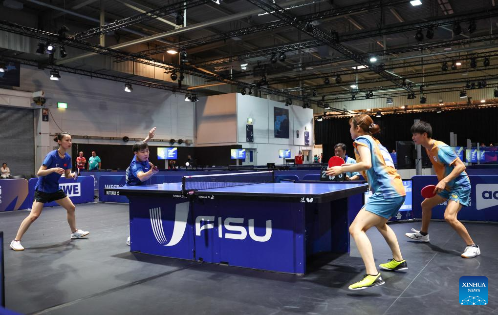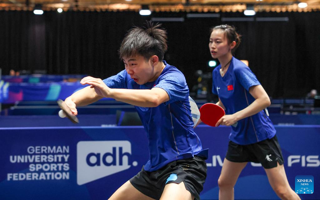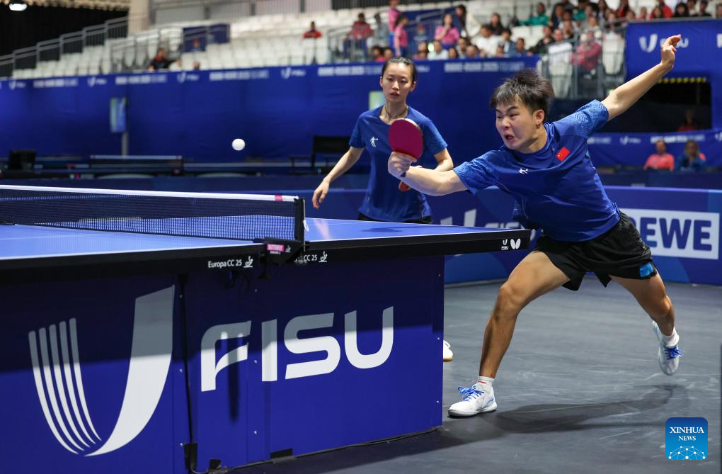 Zeng Beixun/Han Feier (L) compete during the table tennis mixed doubles gold medal match between Zeng Beixun/Han Feier of China and Okano Shunsuke/Idesawa Kyoka of Japan at the Rhine-Ruhr 2025 FISU World University Games in Essen, Germany, July 22, 2025. (Xinhua/Zhang Fan)