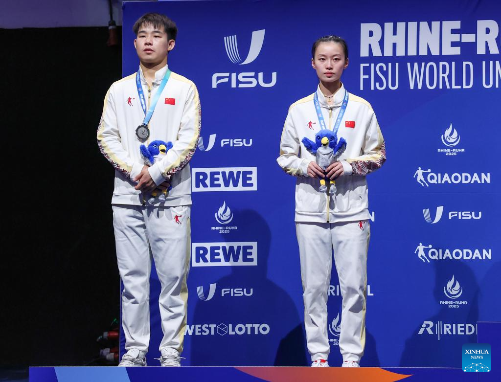 Silver medalists Zeng Beixun/Han Feier (R) of China react during the awarding ceremony of the table tennis mixed doubles event at the Rhine-Ruhr 2025 FISU World University Games in Essen, Germany, July 22, 2025. (Xinhua/Zhang Fan)