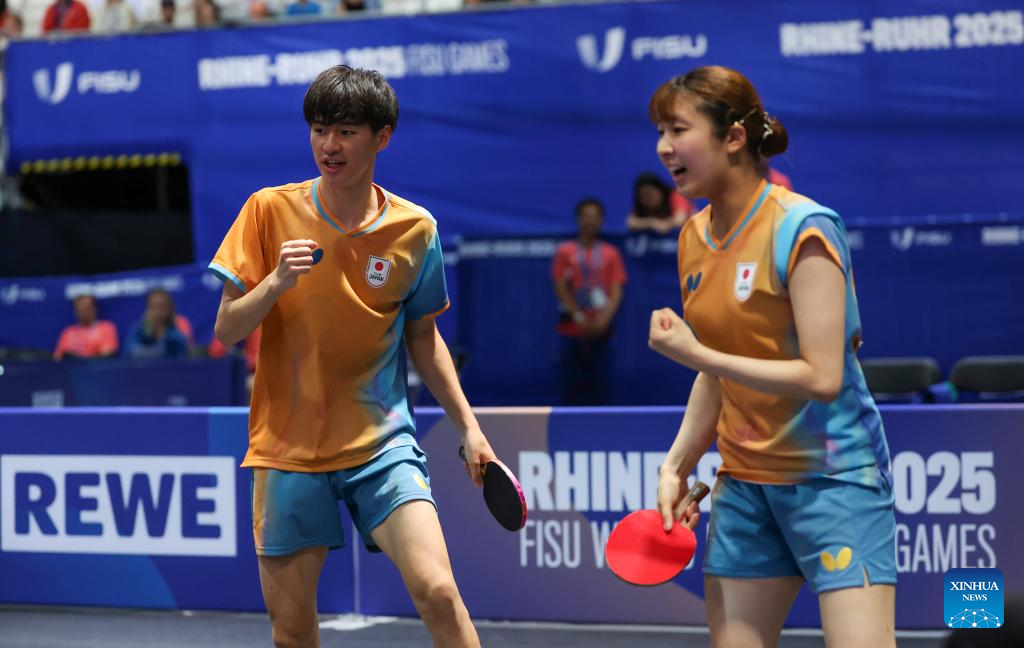 Okano Shunsuke/Idesawa Kyoka (R) celebrate scoring during the table tennis mixed doubles gold medal match between Zeng Beixun/Han Feier of China and Okano Shunsuke/Idesawa Kyoka of Japan at the Rhine-Ruhr 2025 FISU World University Games in Essen, Germany, July 22, 2025. (Xinhua/Zhang Fan)
